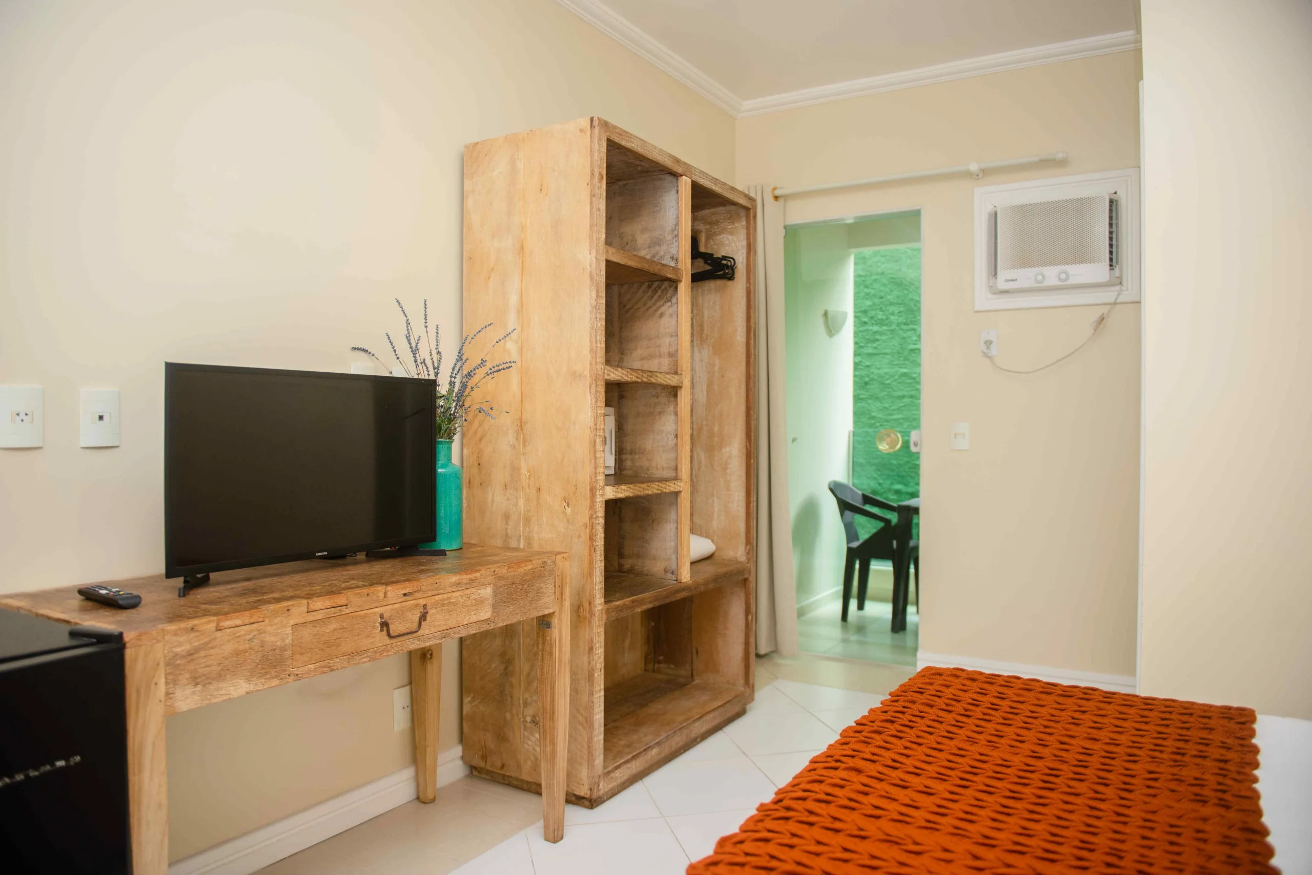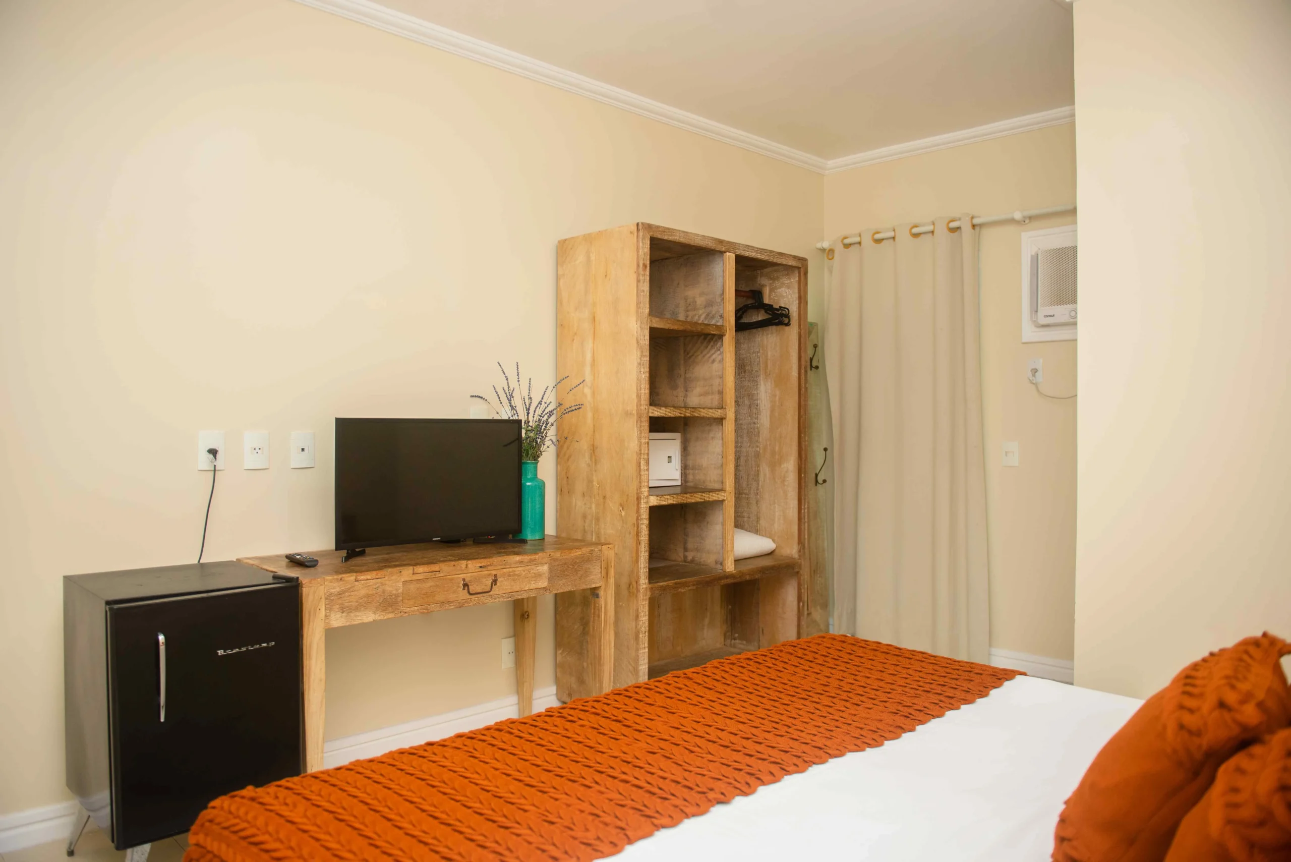 Para seu entretenimento e comodidade, o quarto dispõe de TV LCD, Wi-Fi gratuito e ar-condicionado, garantindo um ambiente agradável e conectado durante toda a hospedagem.
